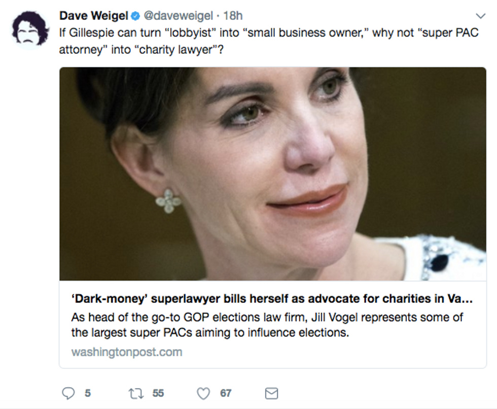 The Republican candidate for Lieutenant Governor is another villain from central casting. State Senator Jill Vogel is an oil heiress who devoted her legal career to representing Republican SuperPACS. She's best known for sponsoring a law that would have forced women seeking early abortions to undergo a transvaginal ultrasound. And she owns a coat made of 101 spotted puppies, PROBABLY!
