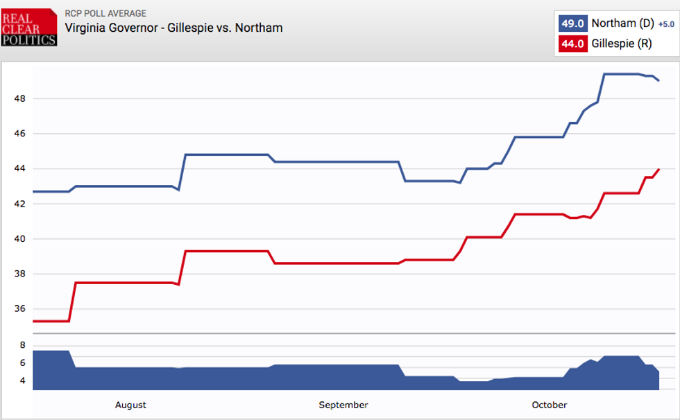 Democrat Ralph Northam is holding on to a nice lead over former RNC Chair Ed Gillespie, and Democratic primary voters outnumbered Republicans 3: 2. So the guy who arranged the marriage between fiscal conservatives and bigoted loons is probably going to lose because he just can't get the Trump stink off of him. SAD! Via the NYTimes ,