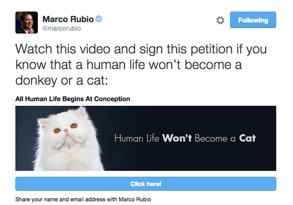 But, see, this is SO clever because of how people on the internet like cats, right? So if you say "human life" with a picture of a kitten, well, that's definitely going to appeal to the young folks, and make them all, "Rubio sure is the bee's knees! I'm gonna give him my AOL e-mail account address and ALL my shiny nickels!"