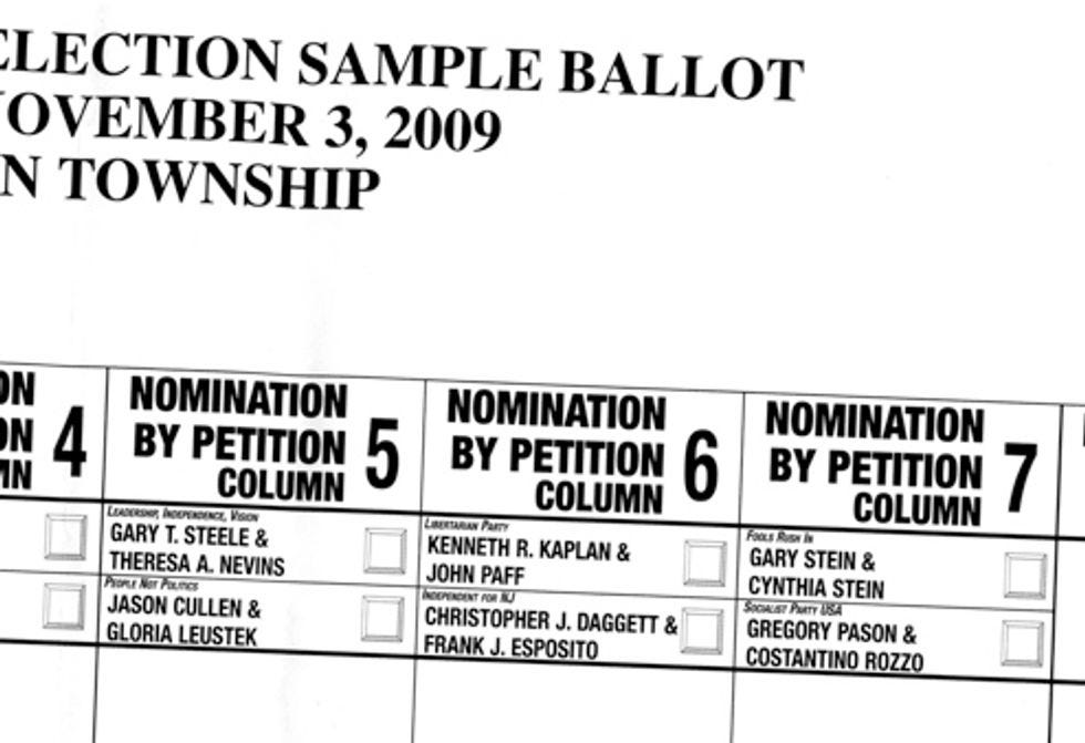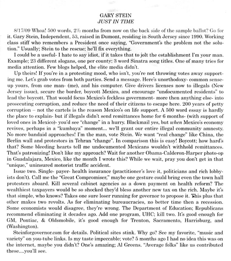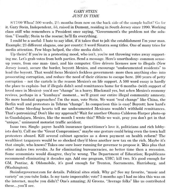 A New Jersey operative, "Leslie," sends us a couple of scans and writes, "My father just called me and asked if I had read the 500 word essay on the NJ Governor's Sample Ballot. I just did, and it is such beautiful madness, I had to share it with you." It is a completely great essay from petition candidate Gary Stein, who is running with his wife on the "Fools Rush In" Party ticket. Let's see what he has to say, about politics.