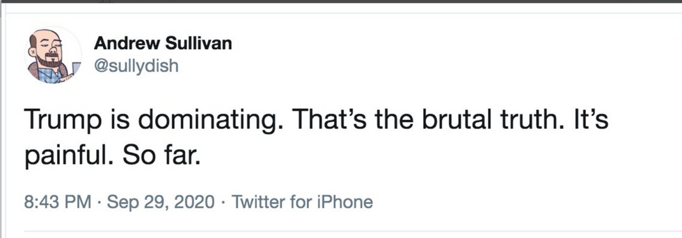 It's been 84 years since the first and merciful-God-willing last presidential debate. Donald Trump was an absolute asshole, constantly interrupting and talking over Joe Biden and moderator Chris Wallace. This was apparently a performance worthy of The Bell Curve Hall of Fame, because conservative deep thinker Andrew Sullivan was scared ... while simultaneously wowed by President Ubermensch.