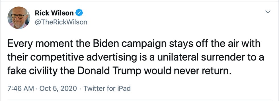 However, some feared Trump might turn things around after his COVID-19 diagnosis. He'd gain the sympathy vote! Biden pulled his negative ads, while Trump's campaign refused because no one who works for the president has a shred of human decency. This would surely hurt Uncle Joe's momentum.