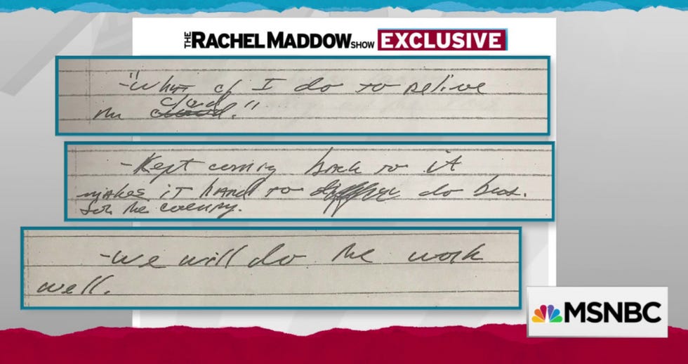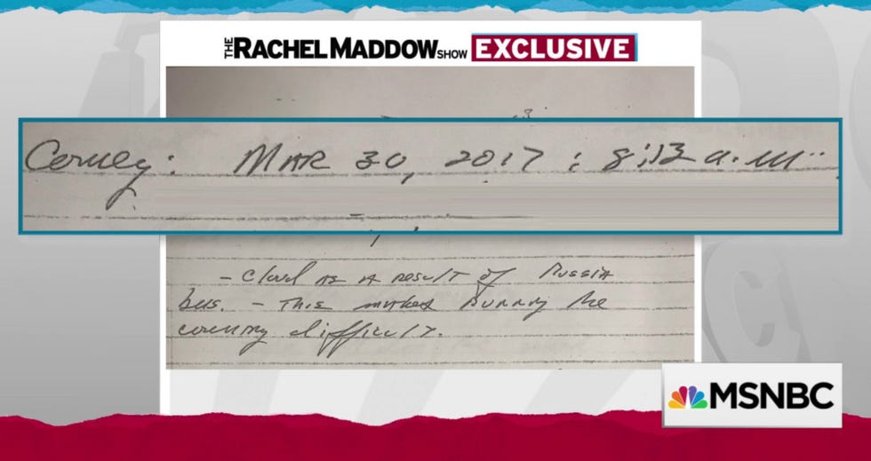 Now, that is a lot of chicken-scratching, but those notes say things like "cloud as a result of Russia business" and "what can I do to relieve cloud." Here's that Rachel Maddow video from last night, of Comey testifying to Congress: