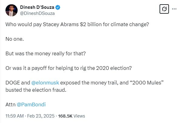 The story blew up last month after Zeldin said he’d discovered the “gold bars” (not actually gold, not actually improper), although the original bullshit “connection” seems to have been made way back in January 2024 by some cleverly lying staffer for the House Energy and Commerce Committee, before the grants had been formalized, although at that time, the committee at least noted that Rewiring America was one of five groups that created PFC. The story spread quickly through the right-wing disinformation-sphere, from Old School Wingnut Queen Pam Geller to Crazy Chaya Raichik’s Libs of TikTok, even to lying old grifter Dinesh D’Souza, who tried to suggest that the grant to an organization not connected to Abrams at all was part of an even more scandalous scandal! The poor grifty asshole is still pimping his 2000 Mules conspiracy even though the book and movie were pulled from distribution for being full of lies.