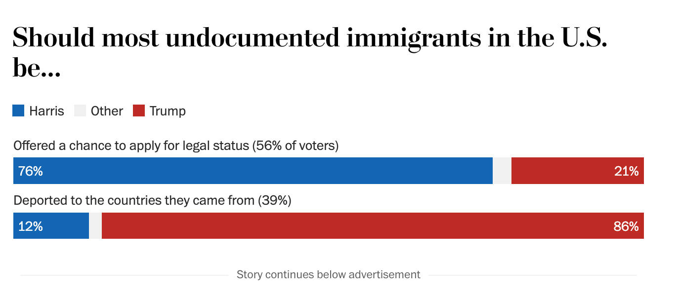 Here’s something stupid to wrap your heads around. According to those exits, 56 percent of the country said they want undocumented immigrants to be able to apply to stay legally. And yet people just voted, in bigger numbers than ever before, for the guy shouting MASS DEPORTATIONS NOW, and that was one of the biggest issues on which people voted overwhelmingly for him.