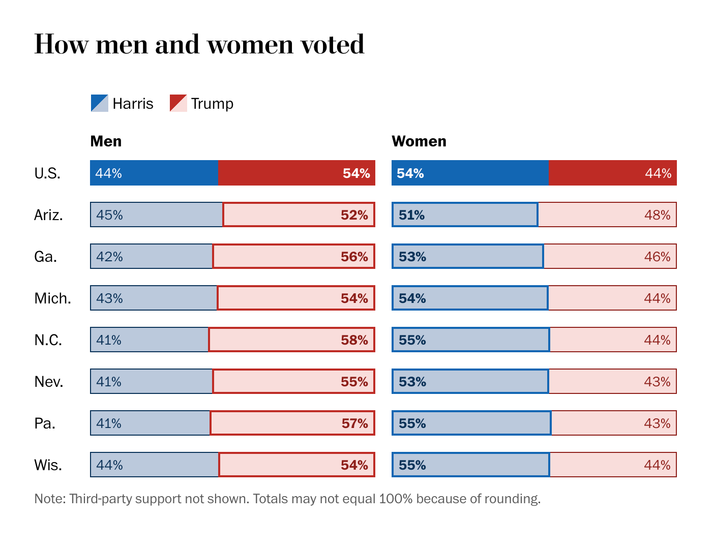 My old women friends were down, down on Candidate Kamala. They said we as a nation were too sexist and too racist, and I yelled at them. But the men’s gender gap, per these exits, was bigger than the women’s! In some swing states, as many as fifty-eight percent of men looked at the rapist and said FUCK YEAH, THAT’S OUR GUY. Oh how I believed the young women and old women (not so much the Gen X women, my own, worst generation) were saving the day! I didn’t just believe it. I knew it.