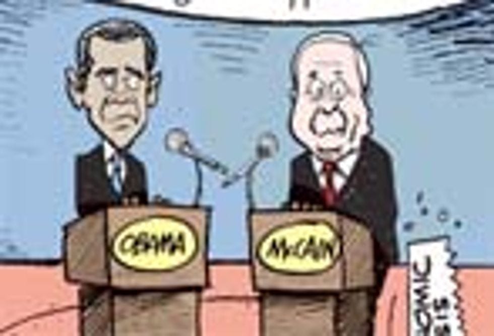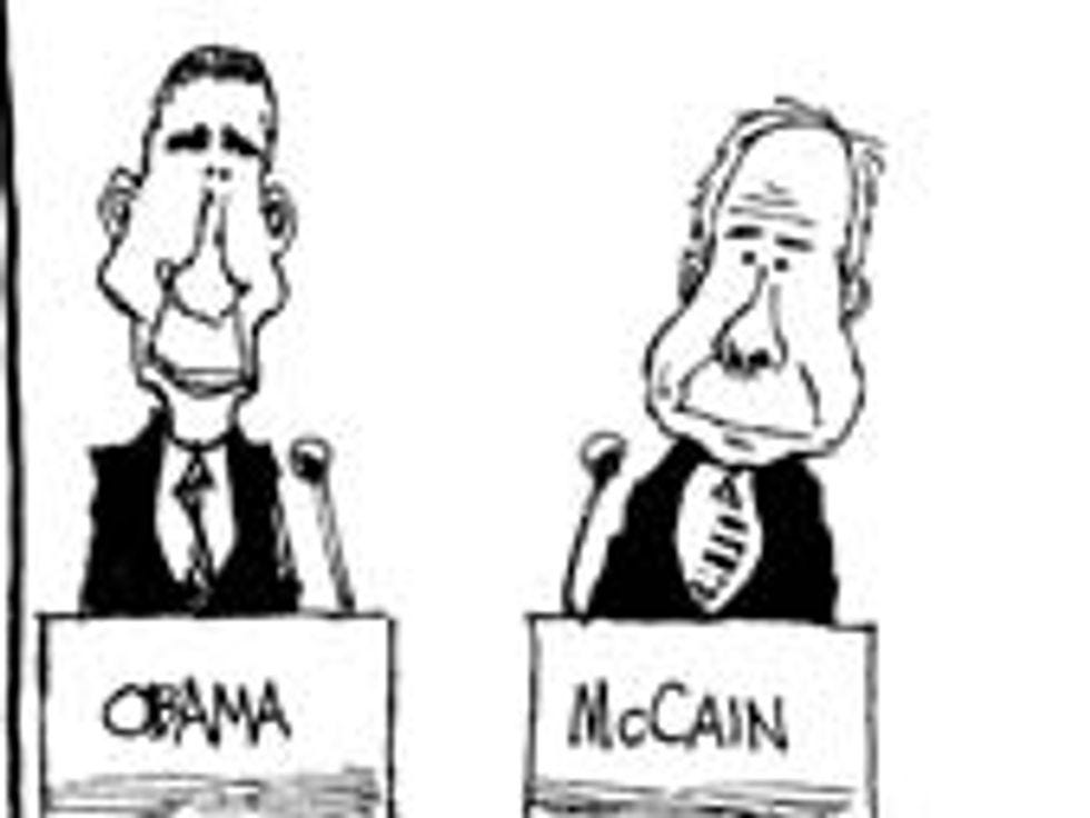 Here is a dirty little secret about your Comics Curmudgeon: I actually have no idea how to draw. Really! None! Therefore, I probably have no place making fun of the earnest doodlings of others who only wish to entertain and educate us about the politics. Nevertheless! I have found thatsomepolitical cartoonists seem to be having problems drawing the current spate of presidential candidates -- which is weird, because you have a comically tall skinny black dude with big ears running against a bald-headed, chipmunk-cheeked old gnome. So this week, inadequate caricatures will becalled out and shamed!(The Sarah Palin drawings actually seem to be pretty good, since cartoonists are studying her photos carefully, while masturbating.)