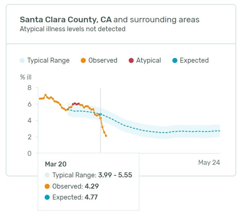 Maddow's videos from last night, and thus her graphics, are not up yet, but she compared Santa Clara County, California, and Miami-Dade County, Florida, as on Kinsa's website you can actually track atypical illness and fever trends down to the county level, which enables you to see what happens when social distancing starts. Remember that California has been on top of this shit, whereas Florida has not. Look at the difference (the blue dotted line is what would be "normal" for this time of year):