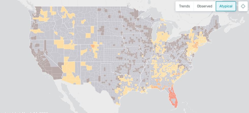 We don't need to really share you the full color code, just know that it's flashing red over Florida, where the Trump-ass governor just can't seem to get his shit together, couldn't be bothered to close the beaches until it was far too late, and so on. You also see a big cluster of orange around New York City, the current epicenter of the coronavirus crisis in America.