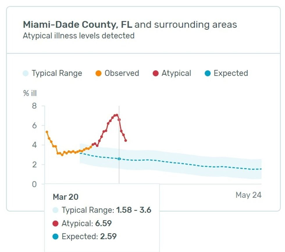 In Santa Clara, you see that atypical illness was tracking up, but then it started to precipitously drop around March 20, far below even normal levels, which seems to suggest that social distancing is also protecting people from the common flu and cold. Meanwhile in Miami-Dade, wow. They've been tracking up for weeks now, really spiked around March 19-20, and while the numbers recorded by Kinsa are going down, they're still way above where they should be.