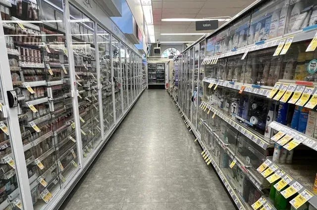 The problem is, the locked-up merchandise doesn’t just impact Walgreens bottom line, it also impacts how people view the world and our society. Recently, I overheard a woman more or less claim that shoplifting was up because people aren’t as good and moral as they used to be. This is bullshit. In reality, crime has been on a downward trajectory for years (though you wouldn’t know it to look at our overcrowded prisons). In 2023, crime fell in every single major category (though you wouldn’t know it to listen to Fox News).