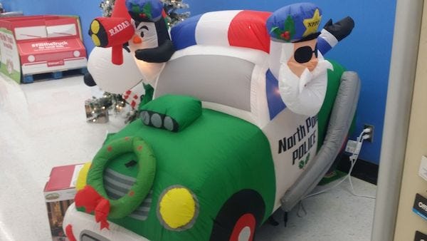 Here is a "fun" picture from your friendly neighborhood Walmart, which shows the real reason for the season: Santa cracking down on crimers and thugs! Notice his North Pole penguin (because "magic") with the radar gun. If you are a white crimer, you will get a speeding ticket. If you are a black crimer -- but obviously we repeat ourself -- then G_d only knows what will happen to you. Before you leave for work today, please kiss your mama and your wife.