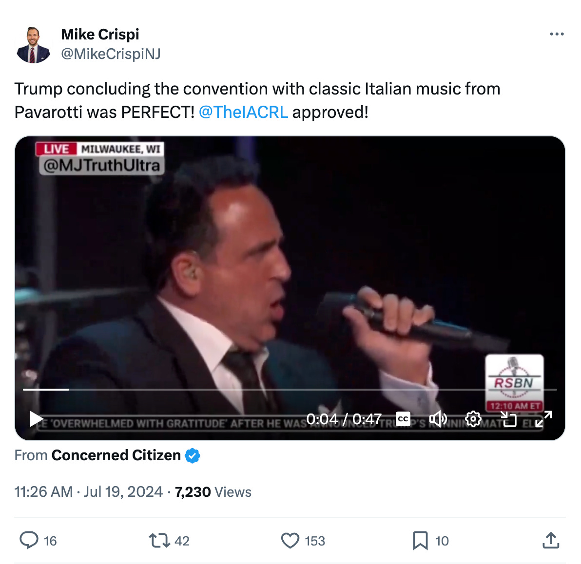 Crispi, meanwhile, is the absolute last person who should ever accuse anyone of disrespecting Italian culture. I only had to scroll a little bit down the IACRL Twitter feed to see a tweet in which he wrote “Trump concluding the convention with classic Italian music from Pavarotti was PERFECT! IACRL approved!” and shared a video of the MAGA tenor singing Nessun Dorma.
