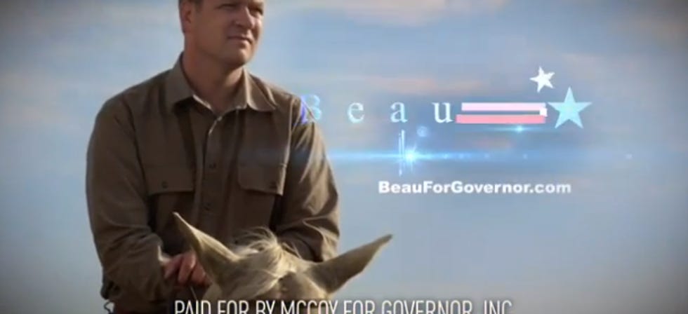 As political satirical fun time bloggers, we applaud the new ease with which any candidate anywhere can make themselves a YouTube and spit out a campaign ad, because that really has been comedy gold for us over the past few years. Even the big folks have used YouTube to get weird, like Ted Cruz with his David Dewhurst = Chupacabra ad in 2011, and our most beloved ad of all time, Carly Fiorina's demon sheep. But you don't need to be a big budget type to get yourself a viral video sort of thingy, as evidenced by this obamahead-slapping fellow, Nebraska state senator Beau McCoy, who is running for governor of the Plains State or the Flat State or whatever they call themselves. Cornhuskers? Or is that Iowa??