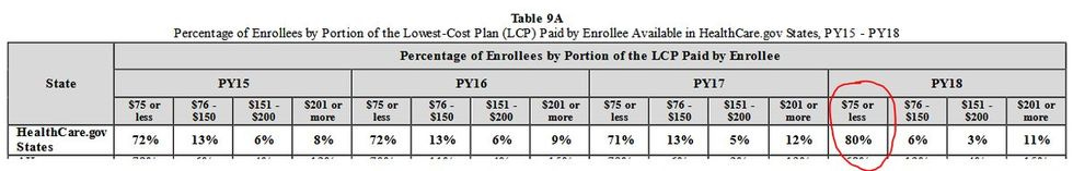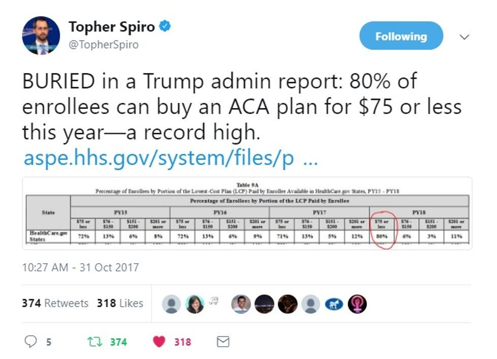 And yet! It's not all terrible news. Even in a Trump HHS document that's aimed at showing how terrible the ACA is, Topher Spiro of the Center for American Progress found yet another surprising indicator of how resilient the ACA has been: