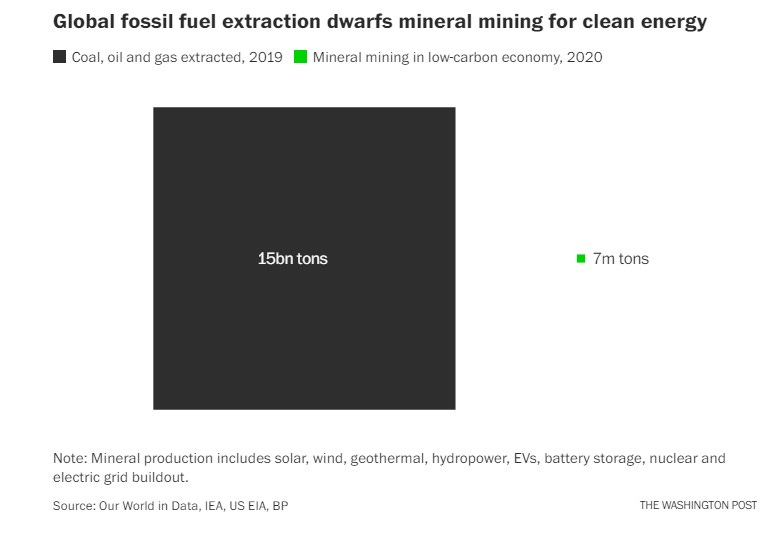 At least until you compare it to the 15 billion tons extracted by coal, oil, and gas in 2019 — most of which got burned, adding still more CO2 to heat the atmosphere — part of the 33 billion tons of CO2 the world emitted in 2019 (obviously, it wasn’t all extracted or burned in the same year). And then they need to extract the same amount year after year to keep the fossil fuel economy fossil fueled. On t’other hand, Coren adds, “Clean-energy technology can use these materials for decades or, if recycled, in perpetuity.”