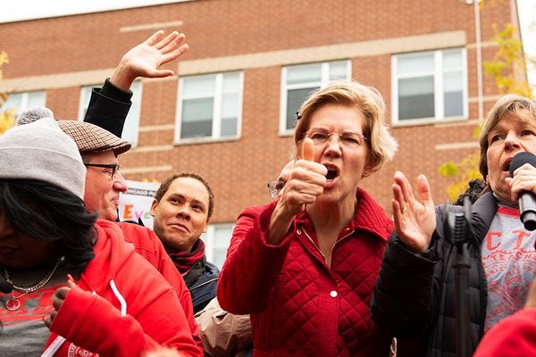 Warren's visit comes as the Chicago teacher strike enters its sixth day. Negotiations between the Chicago Teachers Union and the city took a turn for the worse yesterday after Chicago Mayor Lori Lightfoot sent a condescending letter to the CTU, complaining about school sports programs and asking teachers to end their strike while negotiations continued. CTU President Jesse Sharkey scoffed at the letter, saying that hopes for a quick end to the strike were "dashed." Lightfoot's letter, and subsequent op-ed, has been part of a media strategy to out-progressive the 32,500 striking teachers and support staff who are fighting to get funding for basic school services, like special needs instructors, social workers, janitors, and nurses.