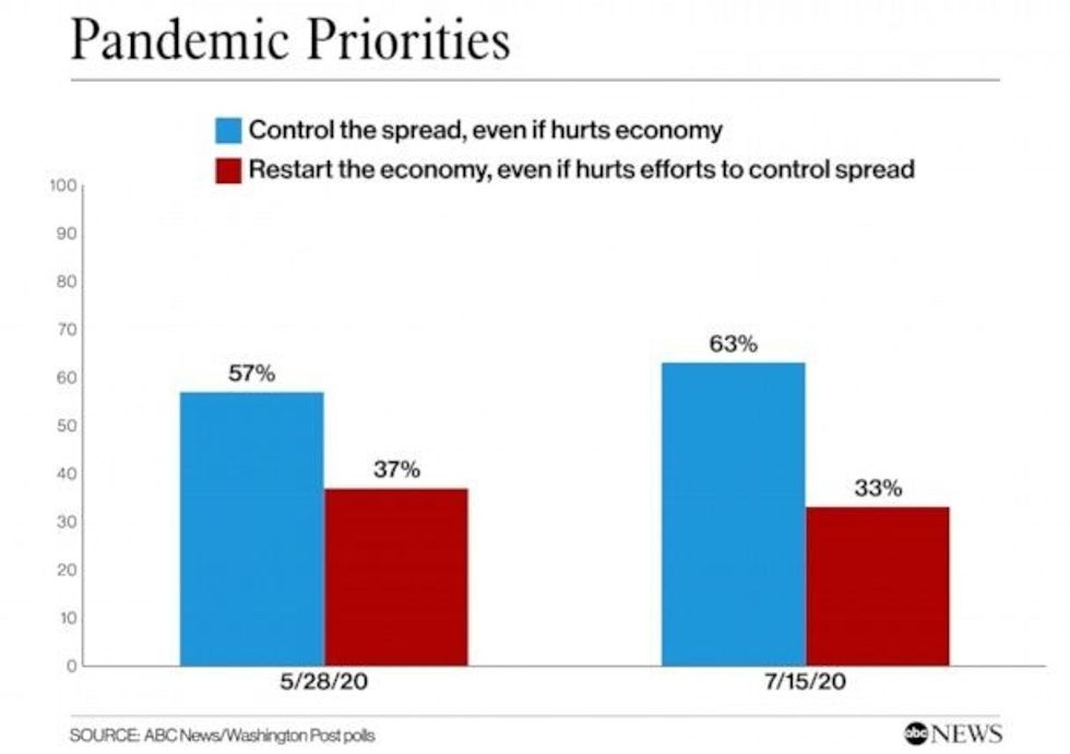 A new ABC News/Washington Post poll out this morning finds 64 percent of Americans saying they don't trust what Donald Trump says about the coronavirus pandemic, which suggests that at least we're not complete idiots, hooray! An increasing majority of people also favor policies that control the spread of the virus, even if that hurts the economy. It's like they noticed what happens when there's a rush to get the economy going again too soon. [ ABC News ]