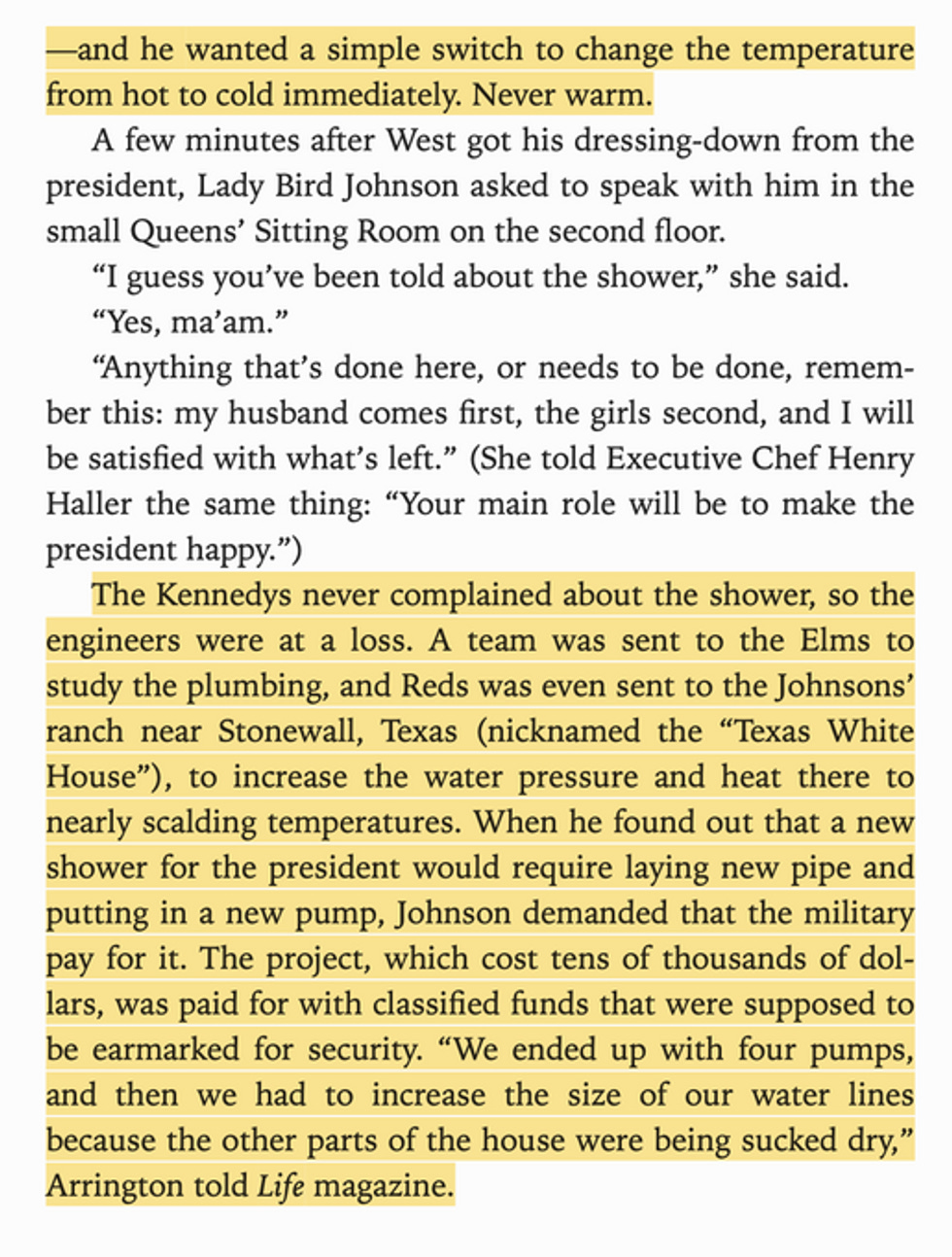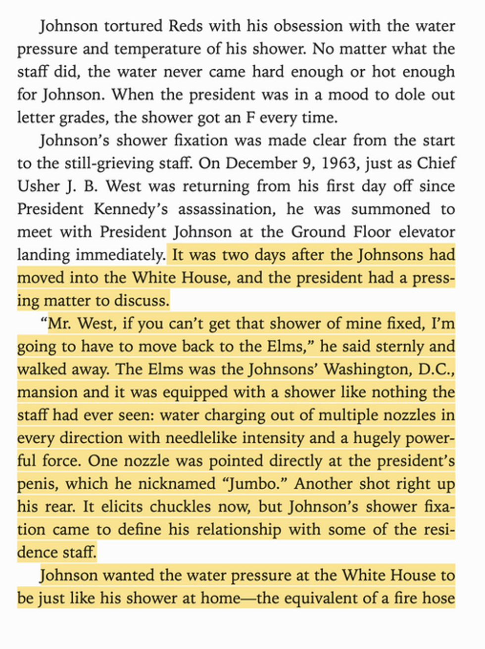 Donald Trump went off on another one of his weird rants about how showers just don't have enough water pressure these days, because environmentalists think there's not enough water, even though it rains . This time he avoided talking about how toilets can't handle his massive dumps, at least. That reminded Washington reporter Andrew Feinberg of this look back at LBJ's obsession with getting a weapons-grade shower installed in the White House. Source is Kate Andersen Brower's 2015 book The Residence: Inside the Private World of the White House :