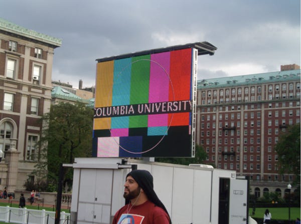 Some 5,000 Columbia students sat on the steps of an administration building to watch the Servicing 9/11 thing on their precious flatscreen teevee. Everyone whined all day Thursday about how the concrete steps were so uncomfortable that it was like sitting on concrete, and yet they continued to sit out there despite this thing being broadcast on smaller teevees, indoors, all over campus. So there they sat, with their Philip Roth or whatever, and complained.