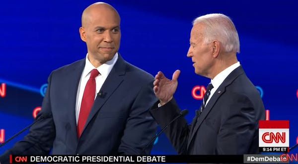 In many ways, Wednesday was Cory Booker's night. In a debate that was mostly boring, tedious, and poorly thought-out, he landed some zingers and clearly had some fun, sparring with Joe Biden over his crime bill record and saying, "If you want to compare records, and frankly I'm shocked that you do, I am happy to do that." Elsewhere, he had a fun moment when he clearly got the best of Biden, who responded by calling Booker the "future president." As Amanda Marcotte notes at Salon, Biden was trying to land a zinger of his own, but Booker was the one who looked more presidential in that moment.