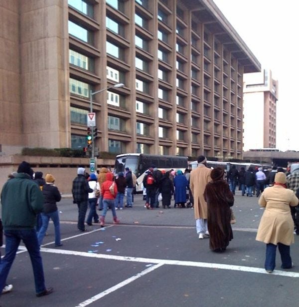 Your latest report from the brave yet doomed COMICS CURMUDGEON: "Attempted to get to mall at 7th, were told it was full and we should go to 14th. Now we are trudging through this Le Corbusier-style hellscape. We will end up watching the speech from Arlington, in an Olive Garden, obviously. Sent from my iPhone." Even elitists need bottomless grease-bread sticks! [Earlier Josh Reports ]