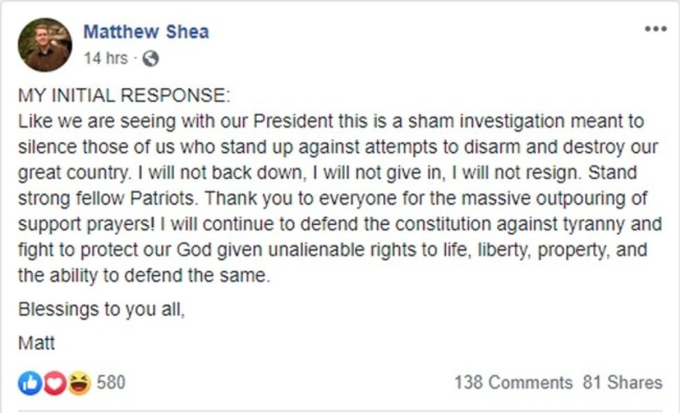 Shea called on members of the Patriot movement to assemble at the man's house to stop the firearms seizure.