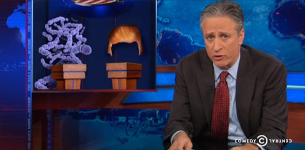 Jon Stewart spent some quality time mocking our collective fascination with discussing the 2016 presidential race, particularly as it is actually the 2014 mid-terms that are right around the corner. Never mind that! Let's speculate about who could run! Stewart is laying even money on antibiotic resistant strep and the petrified exoskeleton of Donald Trump's hair, which is seeming more and more like a decent possibility, but until then, endless speculation about Hillary and Jeb!