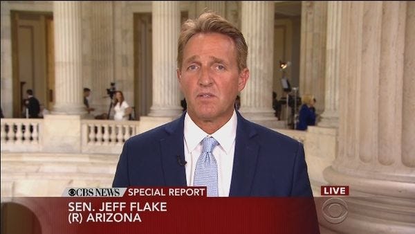 Arizona Republican Senator Jeff Flake is up for reelection next year, and he may be facing a primary on the right for the crime of not loving Donald Trump enough, because what part of "Arizona Republican" don't you understand? Donald Trump has been angry at Jeff Flake since forever, because Flake refused to endorse him during the campaign, and even called on other Republicans to oppose him, which proves that Jeff Flake Hates America. Some pretty bad blood there, according to Politico, which notes: