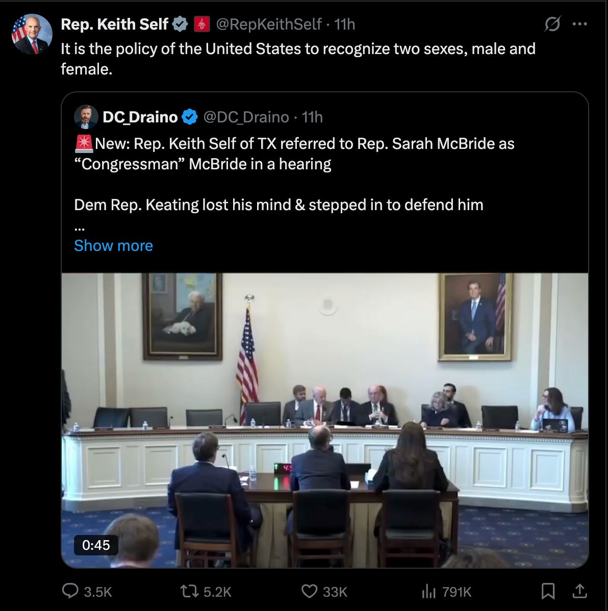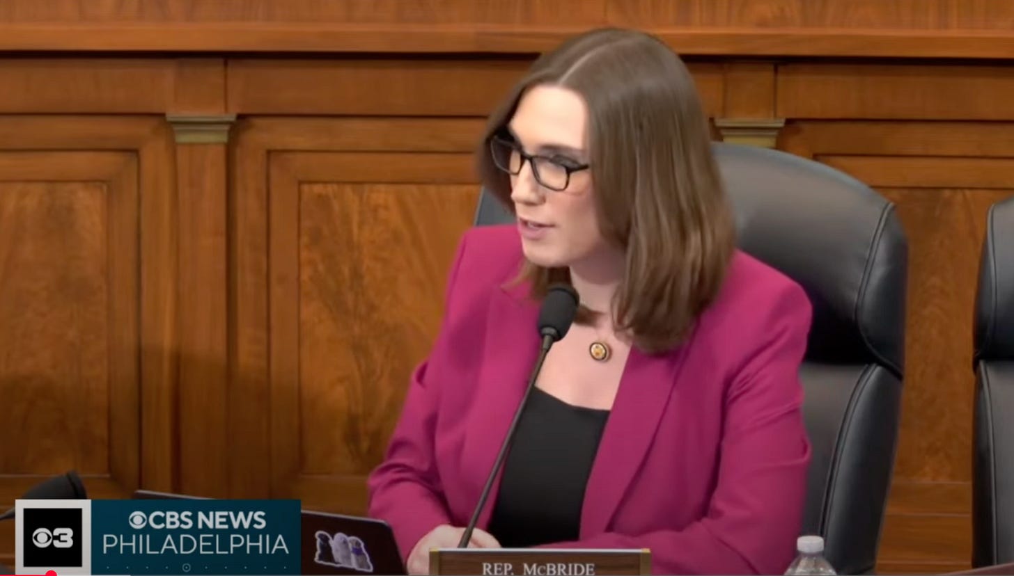 Yesterday, Democratic Rep. Sarah McBride — the first openly transgender rep in Congress, the woman Nancy Mace, Lauren Boebert, and Marjorie Taylor Greene have been running a Nazi genital inspection crusade on — was in a committee hearing, the Europe subcommittee of the House Foreign Affairs Committee to be specific. And the subcommittee chair Keith Self, Republican of Texas, signaled that it was McBride’s turn to speak.