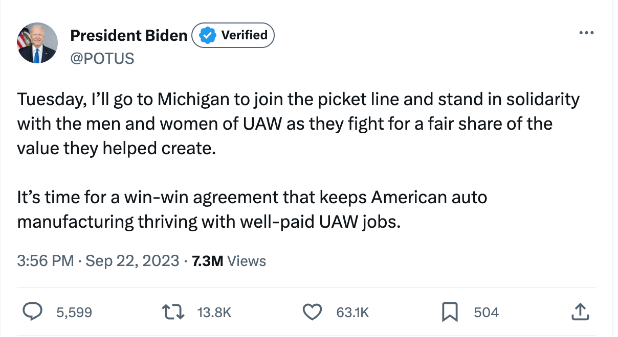On Tuesday, Joe Biden will make history by becoming the first President to join a picket line, when he joins UAW workers picketing in Michigan. That’s a pretty big deal, and we love to see it.