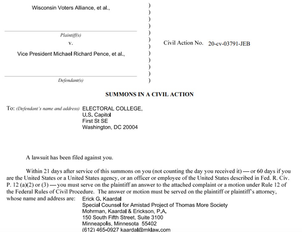 Ah, yes, you pretend that the Electoral College is a real thing and it lives at Congress, both houses of which you have also sued. Along with Vice President Pence, and various elected officials in Arizona, Georgia, Michigan, Pennsylvania, and Wisconsin. In the US District Court for the District of Columbia. Alleging that every election since 1860 has been illegal.