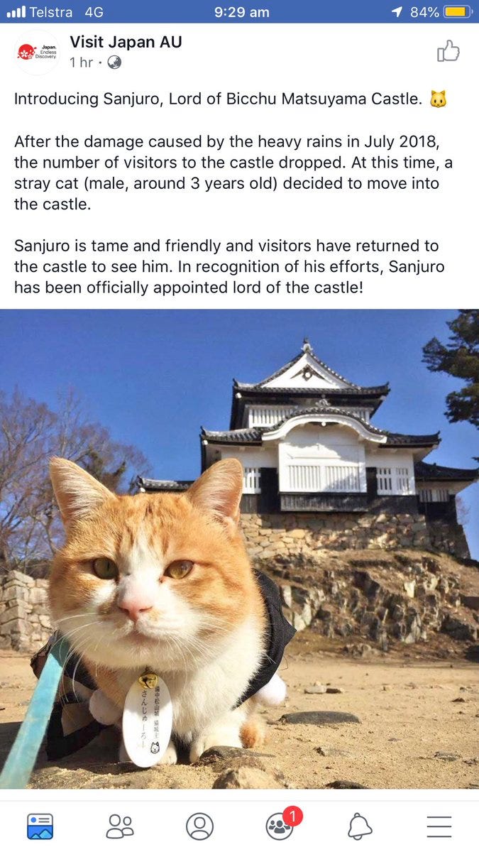 This is just incredibly cute and neato: Japan's Bicchu Matsuyama Castle, built in 1240, was badly damaged by heavy rains in 2018. After that, tourists stopped visiting, and revenues fell sharply. Around the same time, a very friendly stray cat started hanging around the castle. The kittycat picked up the nickname "Sanjuro" ( after a local samurai ) and became a social media star. Tourism picked up, especially when the nonprofit that manages the castle named the handsome kitty the lord of the castle.