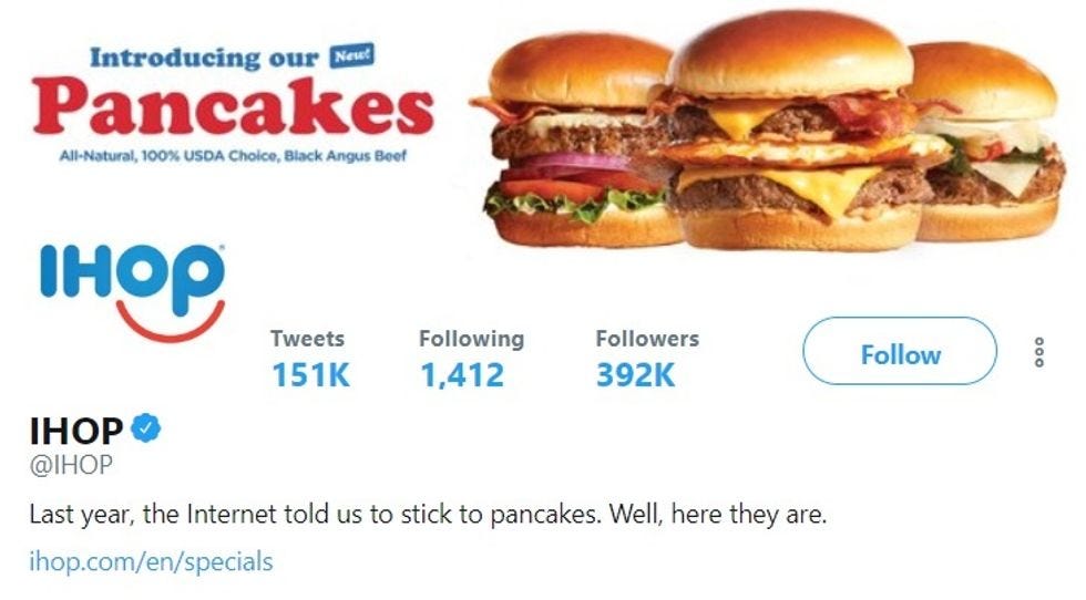 In the ChatCave the other day, Robyn said I had to go read this hilarious essay about IHOP's attempt to make itself more than a breakfast place, because, and I quote, "it is ridiculous and extremely your shit." So I read it, and it IS extremely my shit: A literary-theory meditation on the brand's frustration at "its inability to untether itself from the unyielding association with pancakes carried by the P'." In its latest promotion, IHOP has seemingly embraced the failure of its previous jokey campaign to rename itself "IHOB," because burgers. Everyone ridiculed that, so now they're calling their burgers "pancakes,' including a "pancake" (or burger) that has a pancake in it.