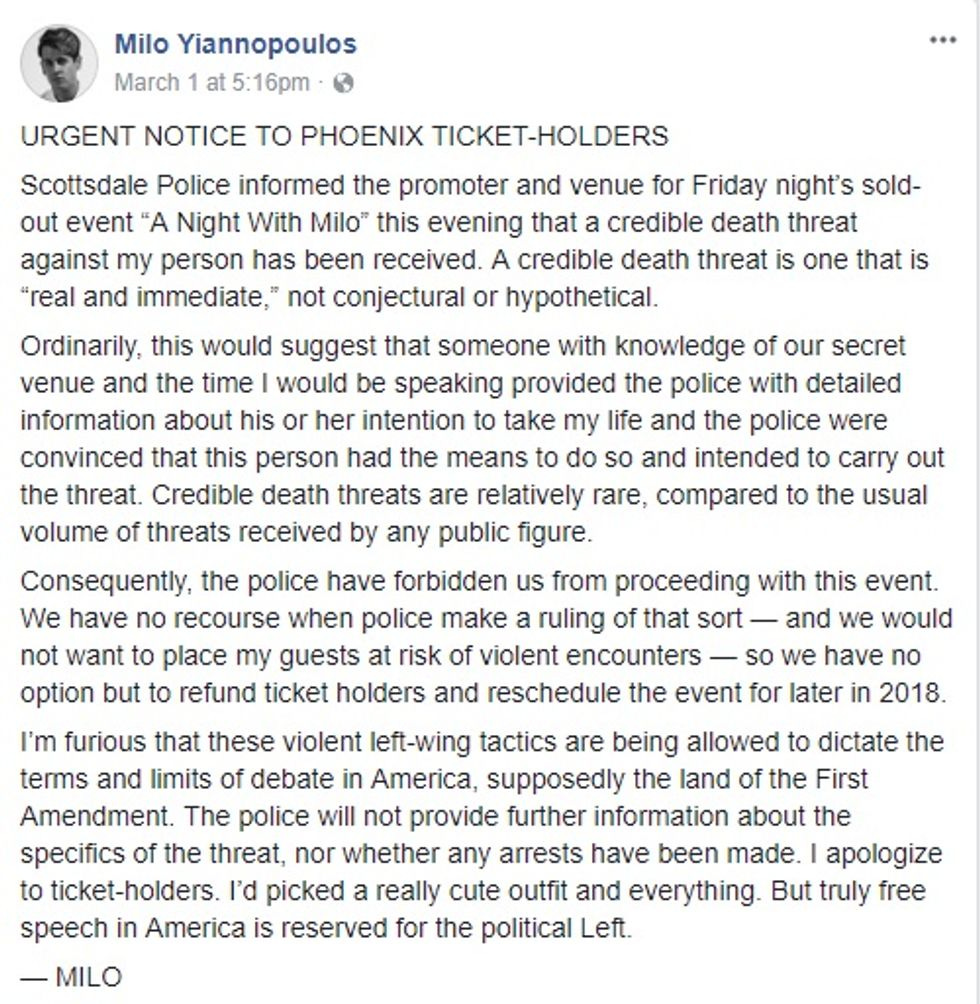 Tragically, Milo had to cancel, as he posted in a Facebook message to fans in an "URGENT NOTICE TO PHOENIX TICKET-HOLDERS," captured here: