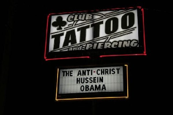 The history of American Tattoos: 1) Poor greasers and sailors and bikers and gang-bangers get tattoos. 2) "Edgy" fad spreads to various musical subcultures, mostly rockabilly and punk. 3) 1990s grunge era seduces even elitist college kids into getting inked. 4) Trickle-down tattoo economics means every single white-trash person now has several ugly tattoos on their fat legs (for gals) and necks (for the gents). 5) Every low-rent strip mall has a tattoo shop next to the payday loan place. 6) Arkansas tattoo parlor proudly aligns with right-wing jesus-freak racists. [ Arkansas Times Blog ]