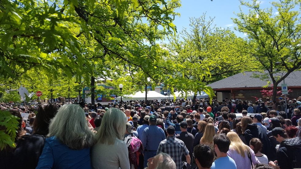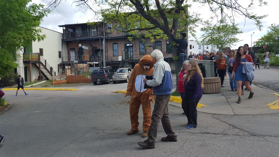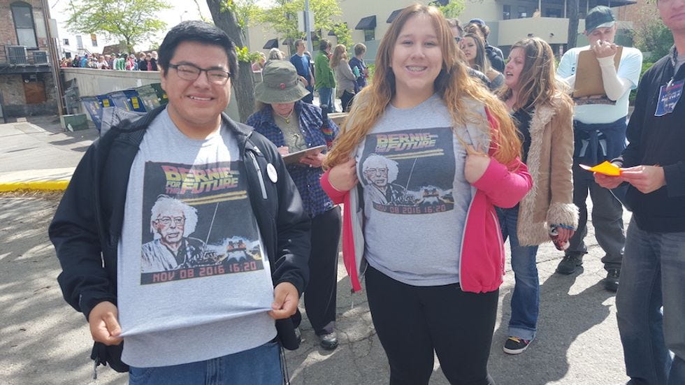 About 2000 were expected for the noon rally, so it was adorable that people were still moseying over at 11: 30 and thought they'd get in. However! There was plenty of room for the several thousand extra folks to stand in the parking lot by the riverside Caras Park, where you could hear Sanders quite well and smile and cheer and whoop and say "TWENTY SEVEN DOLLARS" real cool like. Also, you could buy our last remaining cease-and-desisted Bernie for the Future T-shirts. (We sold our T-shirts out of a wagon like we were trying to hustle up money to get to the next Phish show, and now we can almost pay Robyn this month!) We saw several people wearing them in the wild! And 10 times as many people wearing the same T-shirt, but ripped off by Dastardly People On The Internet, on whom we would very much like to sic Universal's lawyers.