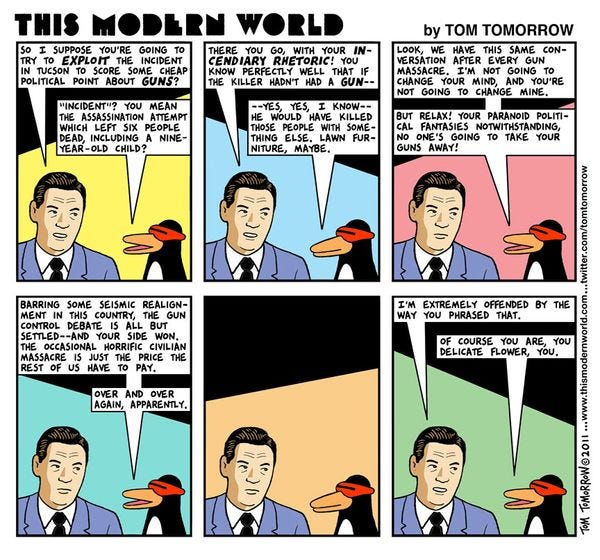 Finally, because we seem to have turned this into a survey of gun control’s more comedic possibilities, we give you this Tom Tomorrow cartoon published in the wake of the Gabby Giffords shooting in 2011. It pretty much sums up our feelings in the wake of Monday’s tragedy: mass shootings are now a permanent fixture of American life. The gun fondlers have won. And we are angry about it. We will be angry every time some nutjob takes a shotgun or an AR-15 or whatever and blows away a bunch of people for no reason. And as a price for their victory, every time that happens, people like Dana Loesch and Colion Noir are just going to have to shut the fuck up for a couple of weeks and listen while we rage. In fact, we think they should have to sit in the middle of a stadium while seventy thousand angry pro-gun control advocates heckle and throw grapefruit at them. It’s the least they can do, and they can be grateful that at least we’re firing tropical fruit and not bullets.