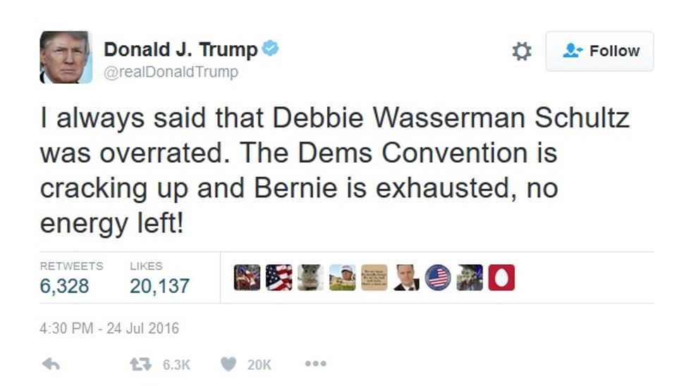 Of course, what it also means is that as the Democratic Convention gets underway, the Bernie Or Bust kids are going to make as much noise as they can -- they did so at the Florida delegation breakfast Monday morning, loudly! -- about wanting a do-over of the primaries, or at least a riot at the convention, because that will finally ensure Bernie gets the nomination he didn't quite win, but deserves for being so sincere. For what it's worth, Bernie Sanders himself, who is much more of a grownup than many of his most ardent/deranged backers, is talking "party unity," not "Bern it to the ground." In a statement, Sanders called for moving forward with less fuckery of the sort that Wasserman Schultz brought to the the 2016 primaries: