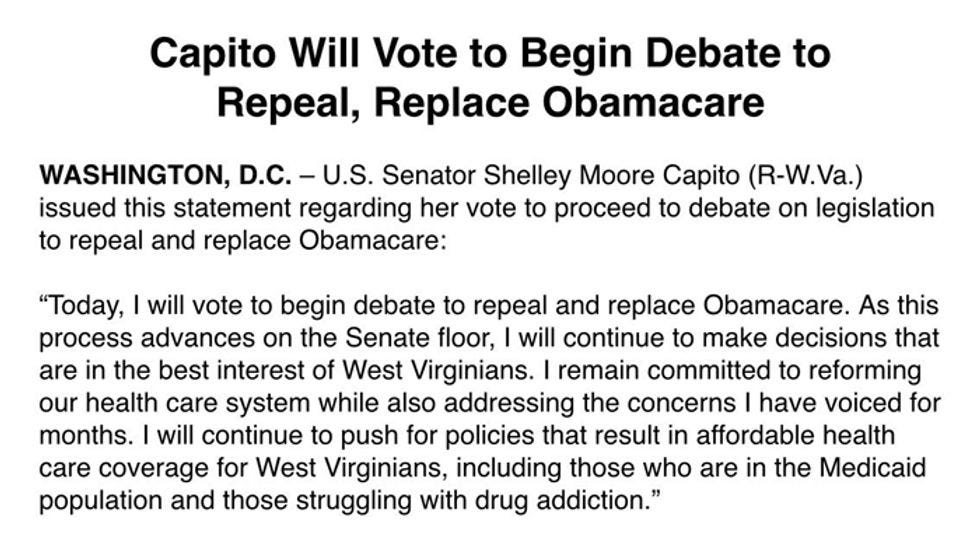 There is so far no evidence whatsoever of a replacement plan that won't slash Medicaid by hundreds of billions of dollars, or that won't result in at least 22 million people losing healthcare. And yet, earlier today, Capito tweeted this statement: