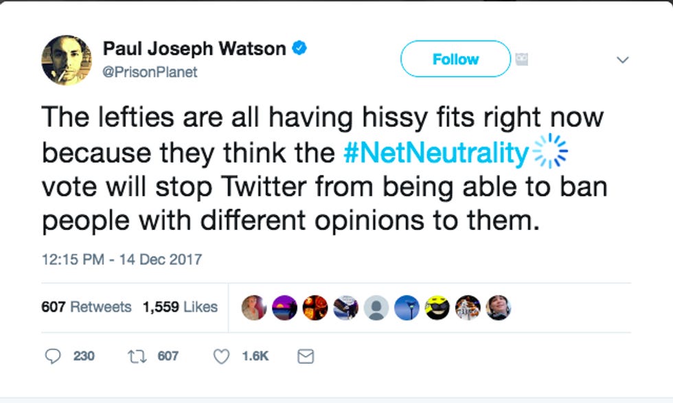 To be clear here, net neutrality will not, for any reason, prohibit Twitter from banning people who violate their terms of service. They will still be able to ban people, but now your ISP can charge you more to stream Netflix if they want. Oh, and it will actually make censorship more likely, not less.