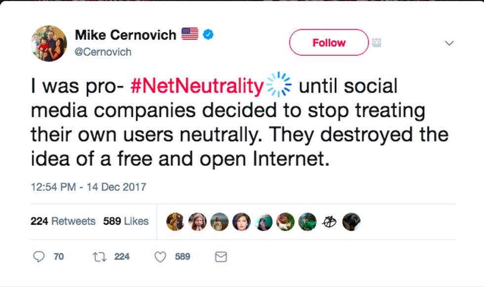 It was, of course, Ajit Pai himself who first put this idea into their heads. At some "free market" conference earlier this year, he explained, “When it comes to an open Internet, Twitter is part of the problem. The company has a viewpoint and uses that viewpoint to discriminate.”