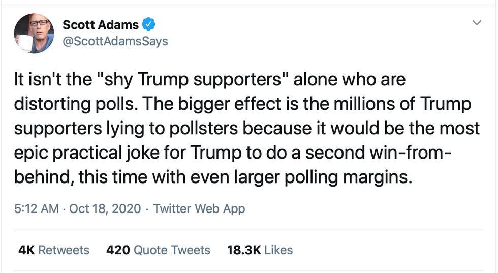 But Adams holds firm in his delusion that “shy" Trump supporters are epically trolling pollsters. Most of these people don't have the sense to come in out of the coronavirus but they have somehow coordinated this complex plot designed to make smarty-pants math geeks look foolish. There are more fulfilling ways to pass the time, even during a pandemic.