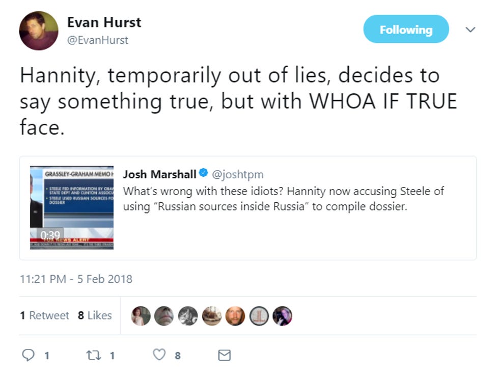 We explored why this is horseshit in our post about how it's entirely possible Devin Nunes hasn't even read his own damn memo . It would appear that the Fox News/House GOP/Donald Trump cohort have decided that it would be OK to slip some truth into their ratatouille of bugfuck conspiracy theories once in a while , as long as they say it BREATHLESSLY! like the actual truth is a SCANDAL! Because if CHRISTOPHER STEELE! used RUSSIAN SOURCES! for his DODGY DOSSIER! and HILLARY! was behind the funding for that work, that means HILLARY! colluded with RUSSIA! to MURDER DONALD TRUMP WITH URANIUM EMAILS OR WHAT HAVE YOU!