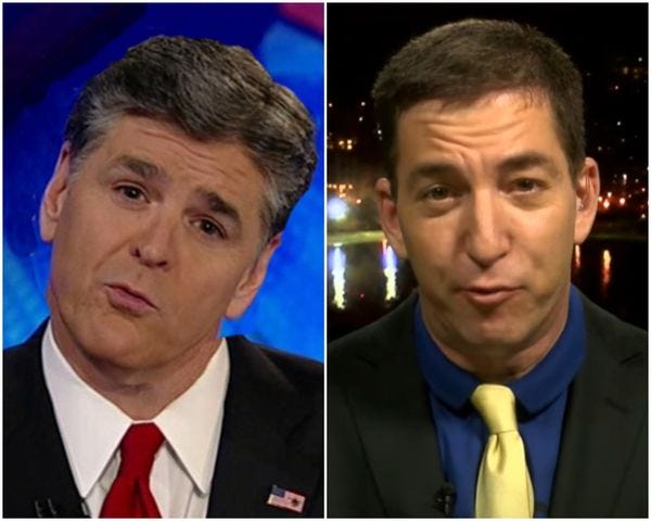Remember how Greenwald doesn't get to go on MSNBC anymore because Rachel Maddow hates him, but he does go on Fox News, because they scratch his belly?