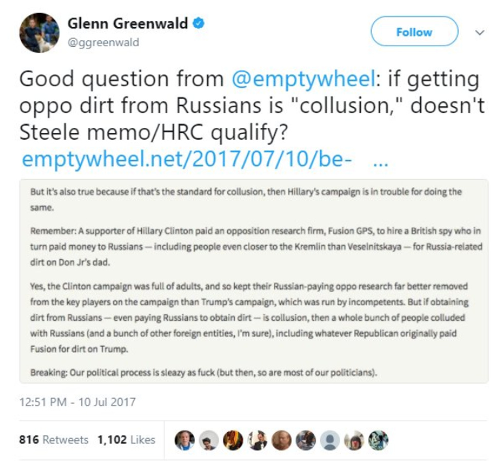 Here's Glenn Greenwald, who is either a witting or unwitting Kremlin asset, tweeting last July, dancing the very same #WhatAbout jig last that Hannity is dancing now, about how "If dossier intelligence came from Russia, HILLARY IS THE REAL RUSSIA!"