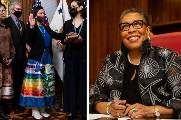 A bit more on that Haaland photo, from Indian Country Today, which is just one of many Indigenous news outlets kvelling over Haaland's confirmation and swearing in. We learn Haaland was sworn in as her daughter Somah held the Bible, and that she wore a turquoise necklace with a pendant of the Zia symbol to represent her home, the Laguna and Jemez Pueblos in New Mexico.