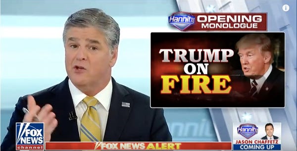 I'm not a white person of a certain age terrified that my place in the world is diminishing thanks to an advancing modernity I don't fully comprehend, but if I were, I'd find FOX News a wonderful resource. The sad sack liberal or average person of color scans the news in horror each morning to discover mounting evidence that the current president is a mentally unbalanced recreational liar who acts like a wiseguy from Goodfellas. But if we were just open-minded enough to visit our friendly neighborhood Sean Hannity, the Mr. Rogers for petty racist children of all ages, we'd feel a lot better: