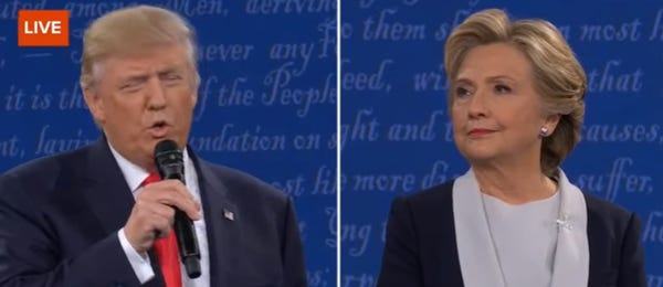 Hillary's like: Nukes? People don't want you near them. Trump rambles a while about "200 generals and 20 Medal of Honor winners" and ends by calling Hillary a proven liar while lying about not saying a bunch of stuff he said about nukes, on tape.