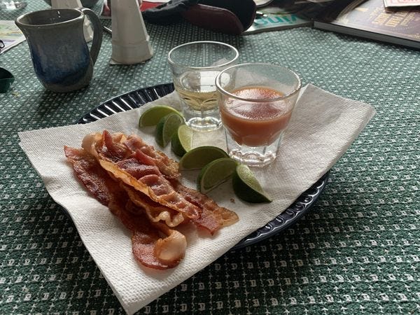 This entire process of bacon, lime, juice, tequila, and sangrito tastes like a deconstructed bloody Mary. I’d encourage that notion. If you had a few avocado slices on the side, this would be an ideal brunch. I’d rather have tequila for breakfast instead of a hangover remedy.